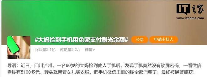 比如在 2023 年 12 月,就曾有这样一则热搜:大妈捡到手机用免密支付刷光余额。